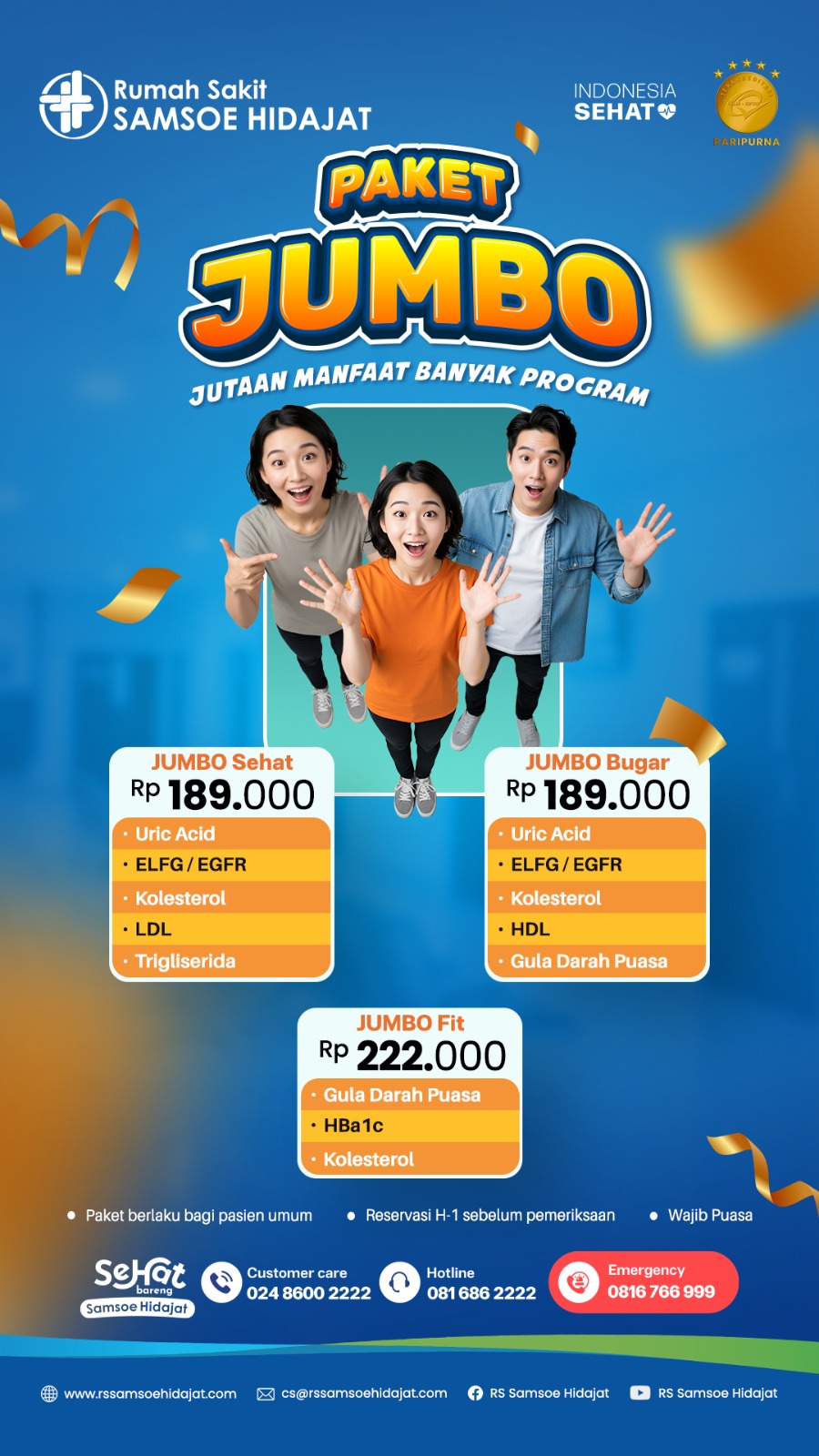 Unit gawat darurat dengan hotline khusus dan ambulans cepat 24/7, Kamar Rawat Inap, Kamar Bedah, Layanan Perawatan Intensif.